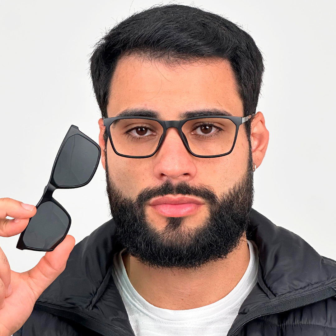 Com o clip-on polarizado de proteção UV400, você transforma seu óculos de grau em óculos de sol em segundos, unindo funcionalidade e elegância em uma única peça.