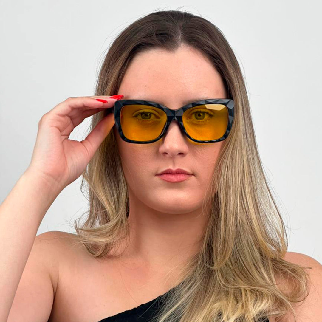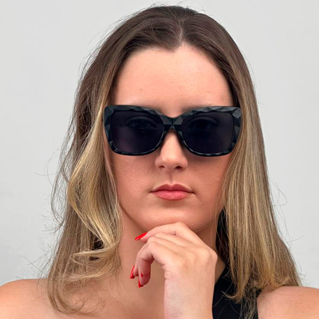Óculos feminino clip-on com design imponente e sofisticado, ideal para quem quer um visual marcante com máxima versatilidade. A armação é preta, de aro cheio, com acabamento texturizado em padrão geométrico facetado, criando um efeito moderno e elegante que se destaca no rosto. O formato retangular grande oferece ótima cobertura e valoriza diferentes tipos de face, mantendo conforto para uso prolongado.